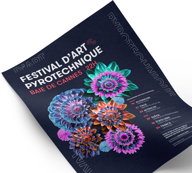 Nous avons été sollicités début mars par le service événementiel du Palais des Festivals de Cannes pour créer la nouvelle affiche et déclinaison du Festival d’Art Pyrotechnique de Cannes 2019. Cet événement international durant juillet et août dans la baie de Cannes était un gros challenge que nous étions fiers de pouvoir relever !